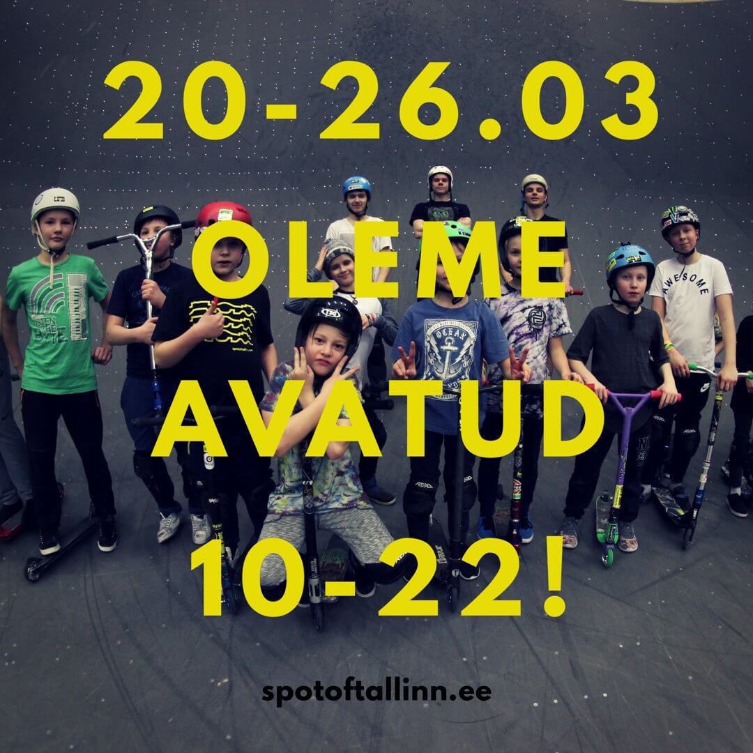 Vaheaja lahtioleku ajad! 20.03.2017 Koolivaheajal 20-26.03 oleme avatud iga päev 10-22. Ootame teid Spotis! Share: Märtsi koolivaheaja laager SPOT’is 21.03-23.03.2017 APRILLI KOOLIVAHEAJA LAAGER SPOT’is 10.04-12.04.2017